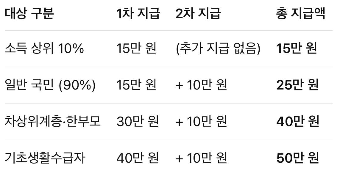 • 2차 지급: 1차 지급 후 소득 기준 상위 10% 국민을 제외한 90% 국민에게만 추가 10만 원을 지급합니다 . 즉 상위 10% 고소득층(약 512만 명)은 1차 때 받은 금액이 최종 지원액이 되고, 그 외 국민들은 1차 금액에 더해 10만 원을 추가로 받게 됩니다 .